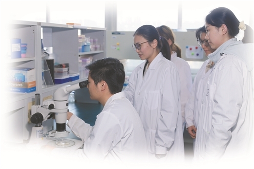 韦燕燕(左二)指导团队成员观察细菌生长情况。