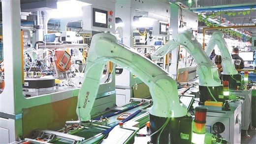 桂林领益制造有限公司生产车间内,机械臂有序作业。