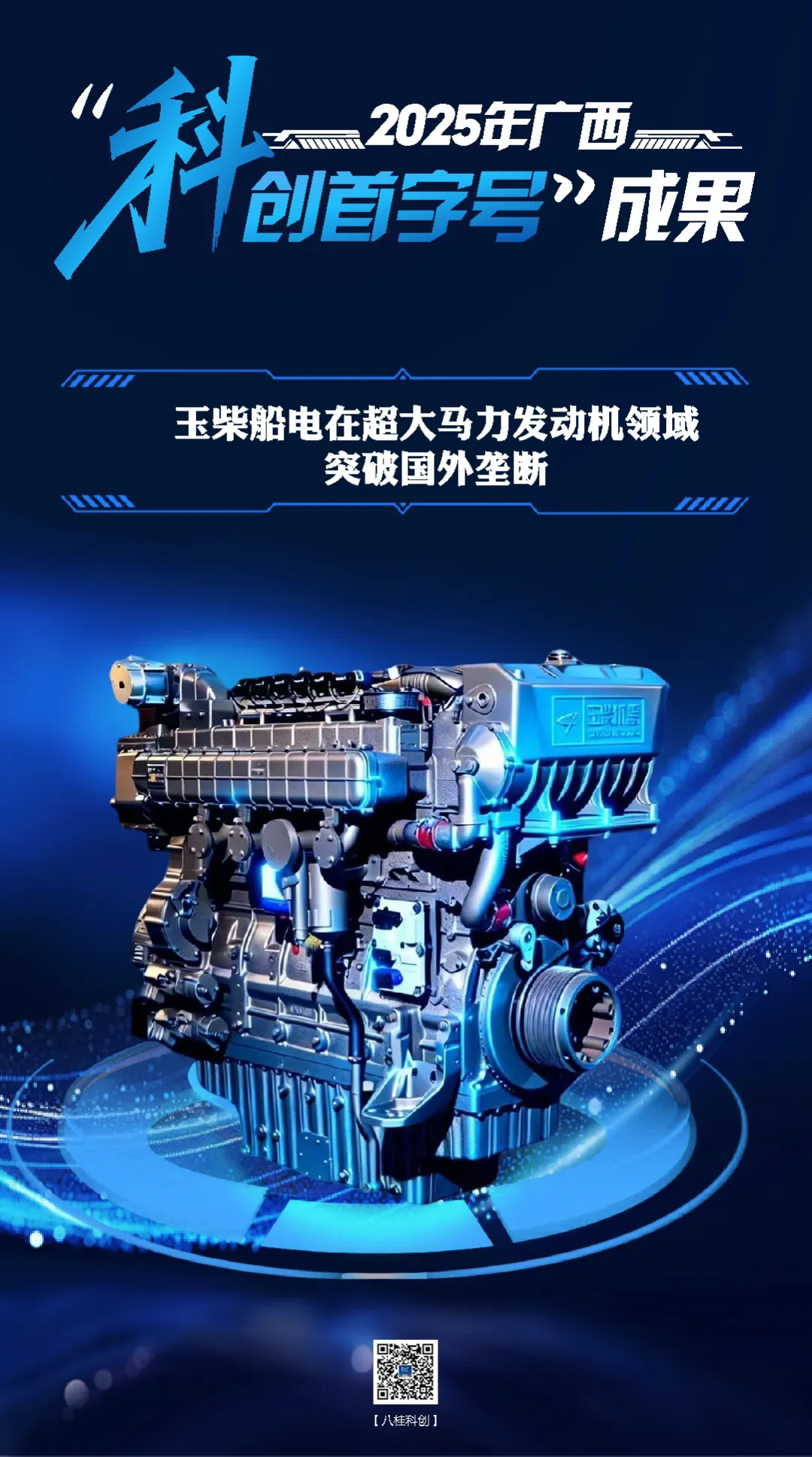 广西玉柴船电动力有限公司采用创新设计的高效燃烧室及先进标定开发技术,融合多点喷射和高能点火技术,突破了甲醇不易点燃的技术难题,成功研制出国内首台最大功率的点燃式单一甲醇发动机——玉柴YC6TFM甲醇发动机,并于2025年9月获中国船级社型式认证,成为我国船用动力在清洁能源领域的重大技术突破。2025年10月,研制发布新一代16缸V型发电动力——玉柴YC16VTF发动机,实现了高强度与轻量化的双重技术突破,最高功率达3971kW,打破了高端市场的国外动力品牌垄断。