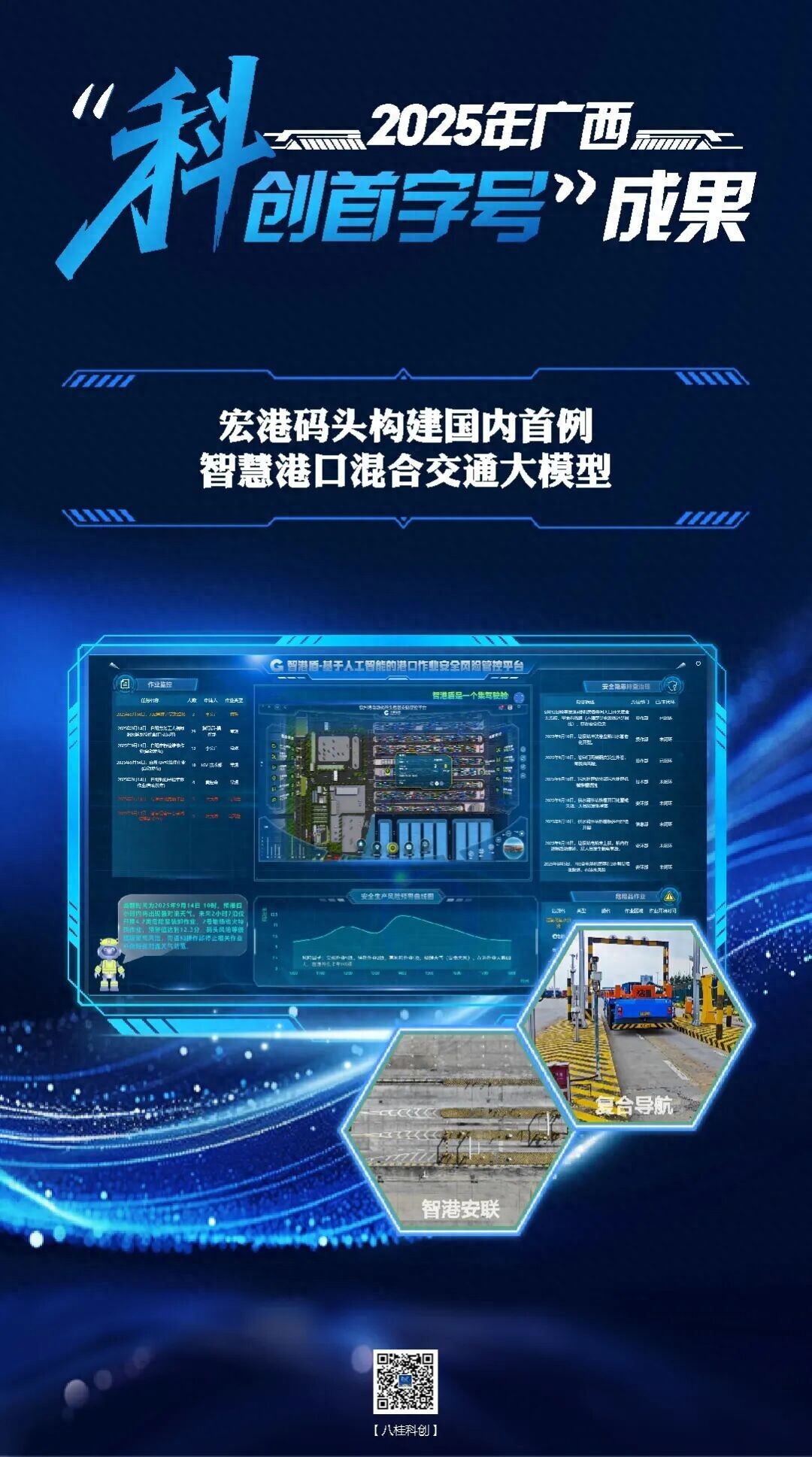 广西钦州保税港区宏港码头有限公司自主研发基于人工智能的港口作业安全风险管控平台“智港盾”,是全国首例专为港口全域场景设计的多模态安全生产垂直领域大模型。该模型突破传统人工巡检覆盖低、数据分散等“卡脖子”难题,实现“人、机、环、管”全流程数字化管控,监管覆盖率提升至95%,隐患直降50%,属于行业首创性突破。在第22届中国—东盟博览会上,“智港盾”亮相“中国—东盟消防人工智能科技设备展”,入选中国港口协会“平安港口”案例。