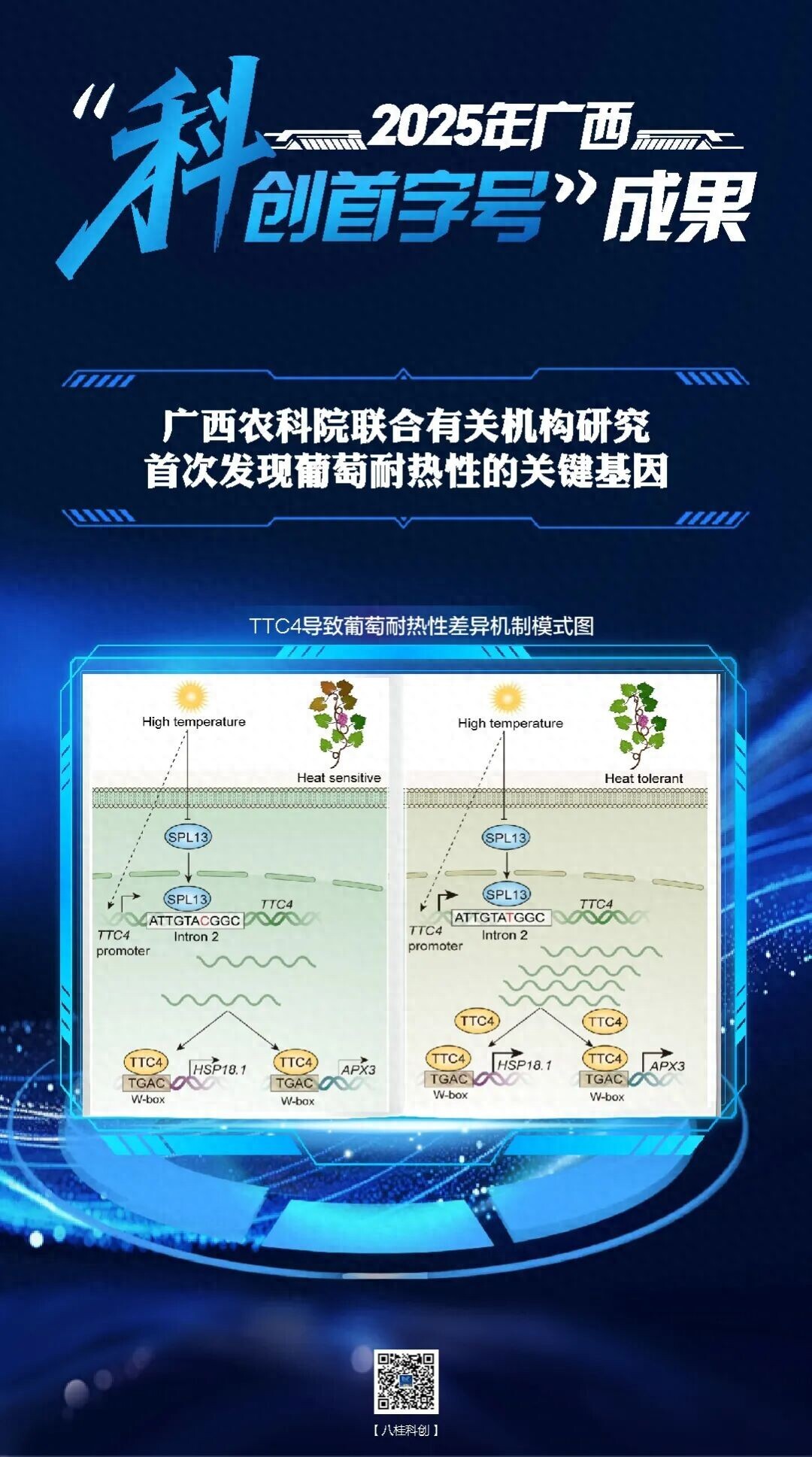 该成果在国际上首次发现了决定葡萄耐热性的关键基因TTC4。该基因的第二内含子可对TTC4的转录表达发挥正向调控作用,其中存在一个单核苷酸多态性位点(SNP-C/T,7631)。研究成果于 2025年6月发表在《Nature Communications》期刊上。该成果为葡萄分子标记辅助选择育种及基因编辑育种提供了关键靶点,可显著加速耐热优质葡萄新品种的培育进程。
