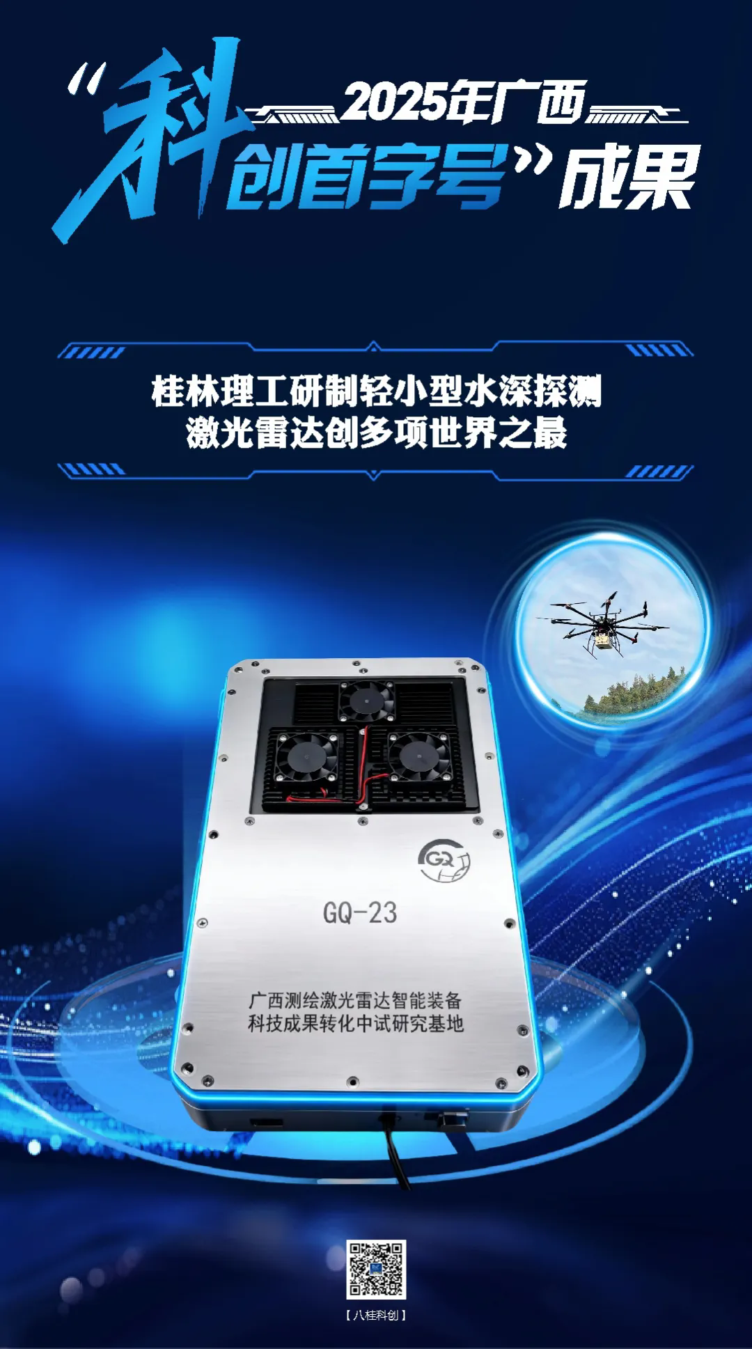 2025年10月,位于桂林理工大学的广西测绘激光雷达智能装备科技成果转化中试研究基地研发的“轻小型水深探测激光雷达(型号GQ-23)”正式发布。这一成果填补了中国国内空白,突破了国外技术封锁,首次研发出无人机载单频激光器,首次突破双模式轻小型透射式光学收发技术,核心部件100%国产化。该成果创下同类产品探测水深最深、体积最小、重量最轻、性价比最高等多项世界之最。