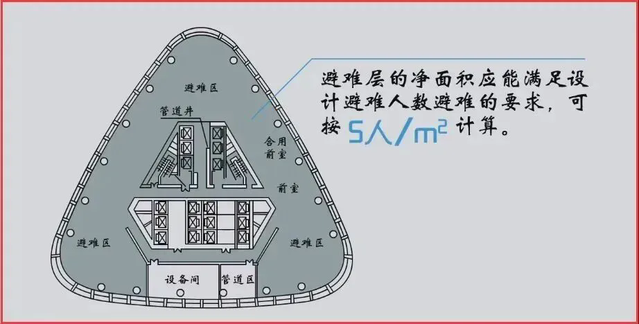 一般来说,避难层净面积是按照每平方米5人的要求设置的,考虑到实际情况,这一标准是按照5人坐在地上的占地面积来计算的。
